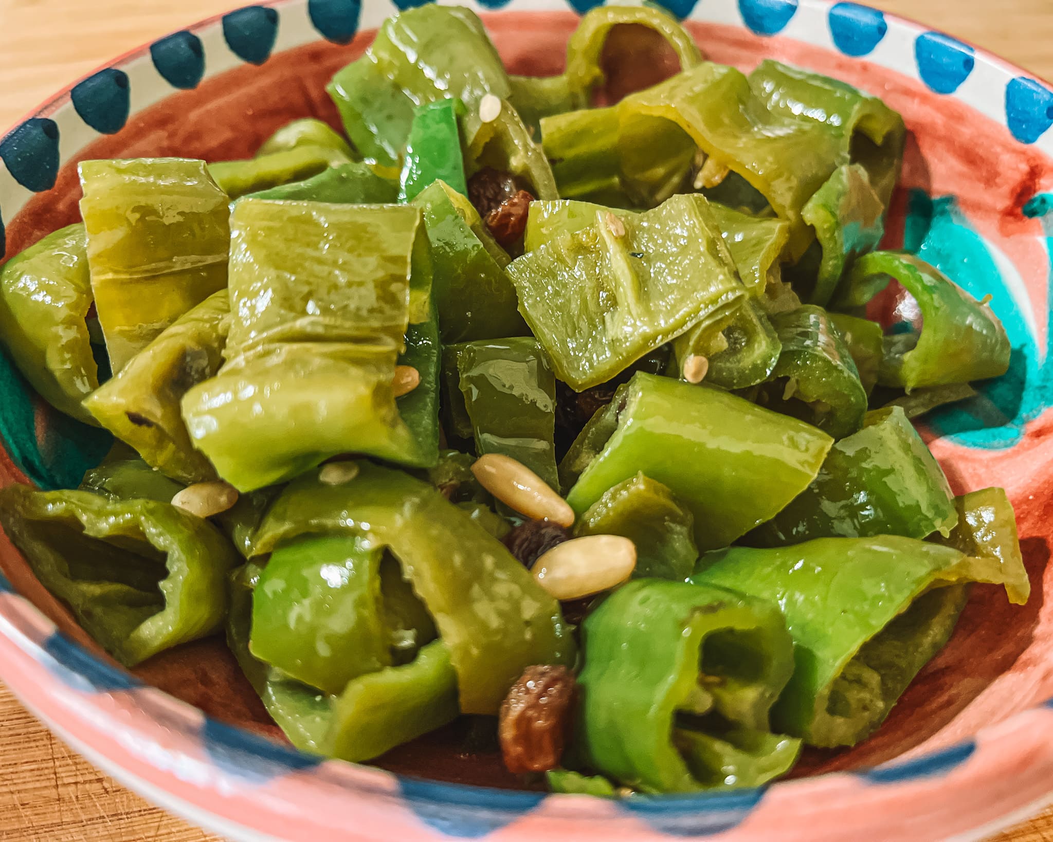 4. Unisci i friggitelli, l’uvetta precedentemente ammollata. Sala, aggiusta di pepe e fai cuocere a fuoco medio per circa 8–10 minuti, mescolando spesso: i friggitelli dovranno risultare teneri ma ancora leggermente croccanti.